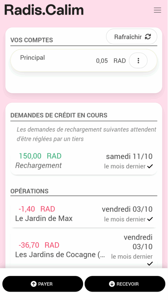 Dans la partie supérieure de l’écran, votre solde est indiqué à droite de l’indication « Principal ».Sur l’image ci-jointe, le solde restant est de Radis 0.05, soit 5 centimes de Radis.