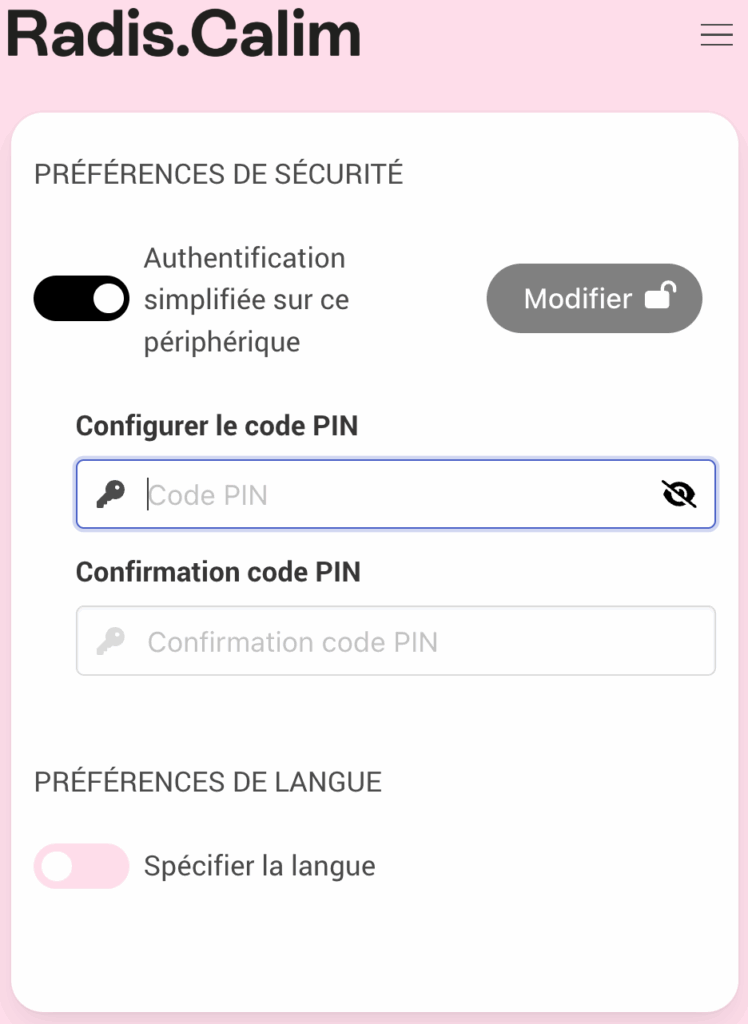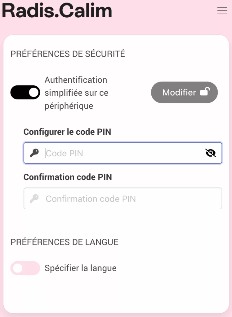 Si vous avez fait une inscription en groupe, les membres de votre groupe doivent utiliser les mêmes identifiants que vous pour se connecter et ensuite définir un code PIN sur leur propre appareil en allant dans les Préférences (en haut à droite).