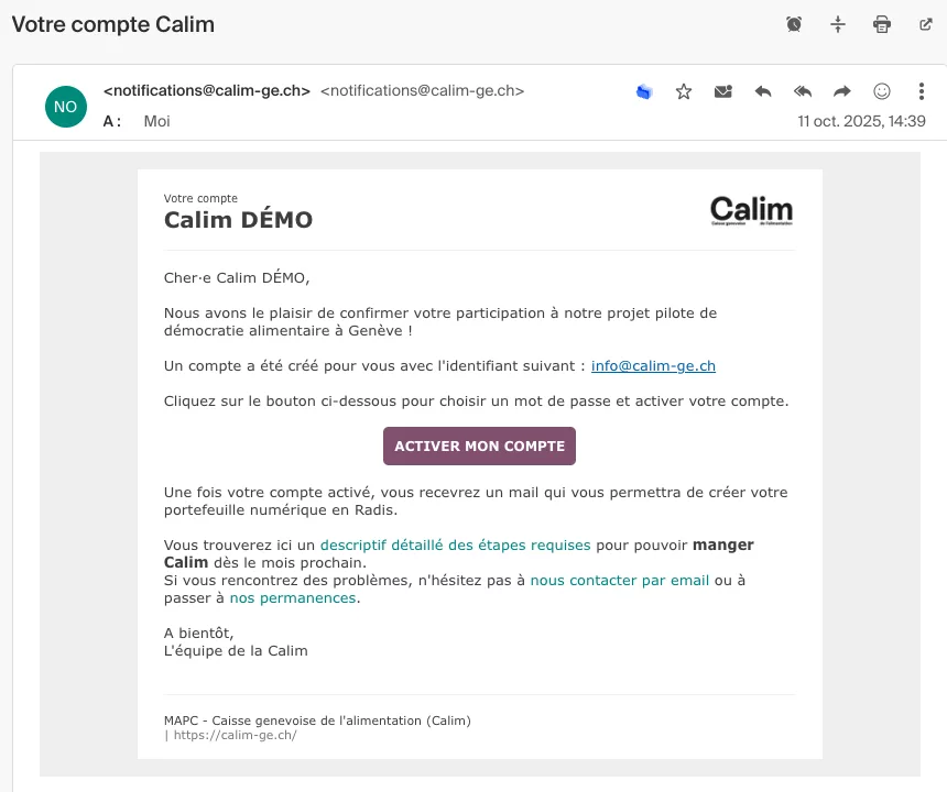 Vous devez avoir reçu un 2e email de notifications@calim-ge.ch qui confirme la création de votre compte et reprend les étapes suivantes.
